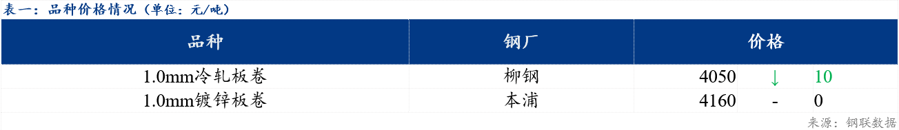 今日市场冷轧板卷主流资源价格4050元/吨,较上一交易日下跌10元/吨;镀锌板卷主流资源价格4160元/吨,较上一交易日持平。