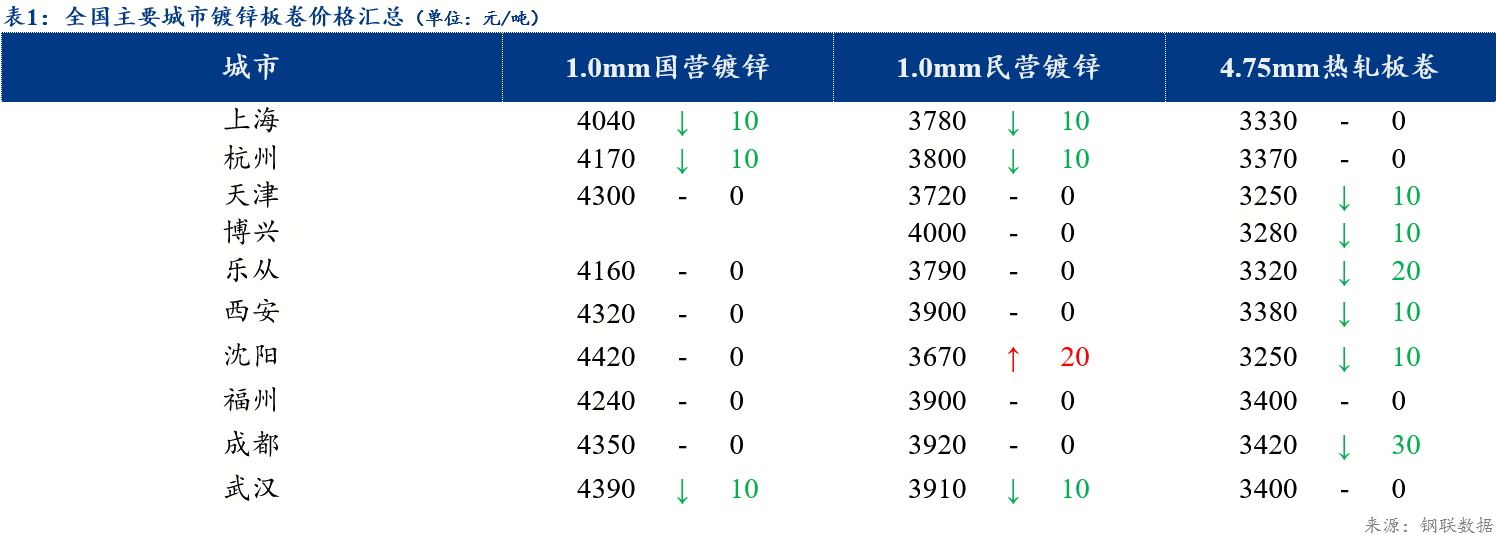 镀锌板国营资源:乐从-上海价差为120元/吨,上海-天津价差为-260元/吨,乐从-天津价差为-140元/吨。民营资源:乐从-上海价差为10元/吨,上海-天津价差为60元/吨,乐从-天津价差为70元/吨。