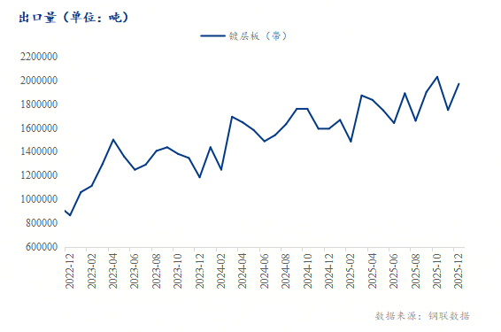海关总署数据显示:2025年12月我国镀层板(带)出口总量共计197.32万吨,月环比增幅12.56%,年同比增幅12.67%。 2025年1-12月份我国镀层板(带)出口总量共计2148.12万吨,年同比增幅12.67%。2025年我国镀层板的出口量再创新高,尤其是年底12月份出口量继续攀升,主要也是因为出口许可证的重新实施,市场抢出口的情况明显,因此出口量有所提升。
