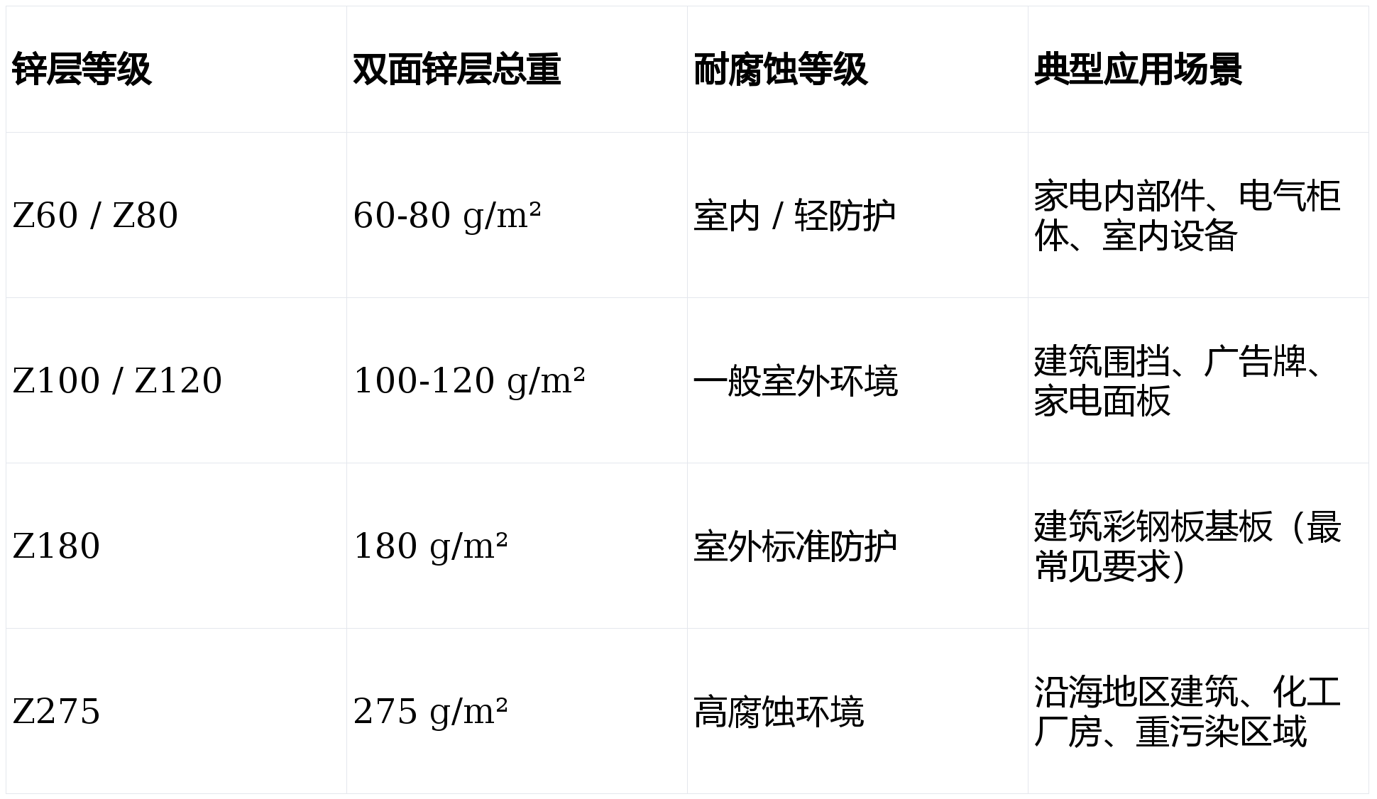 锌层等级:以 “Z + 数字” 表示,如 Z80、Z120,数字代表每平方米钢板双面锌层的总重量(克),是决定耐腐蚀寿命的关键。
